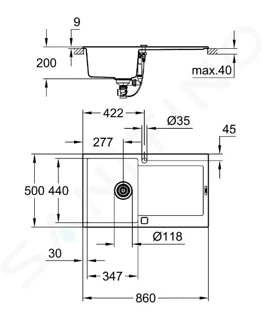 - veľkosť sektora drezu: 347 x 440 x 200 mm