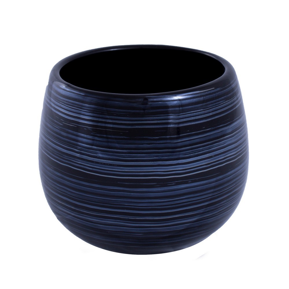 Elegantný a štýlový hrnček zo série ABISSO. Na čiernom plášti sú vodorovné, nepravidelné šedé kruhy.