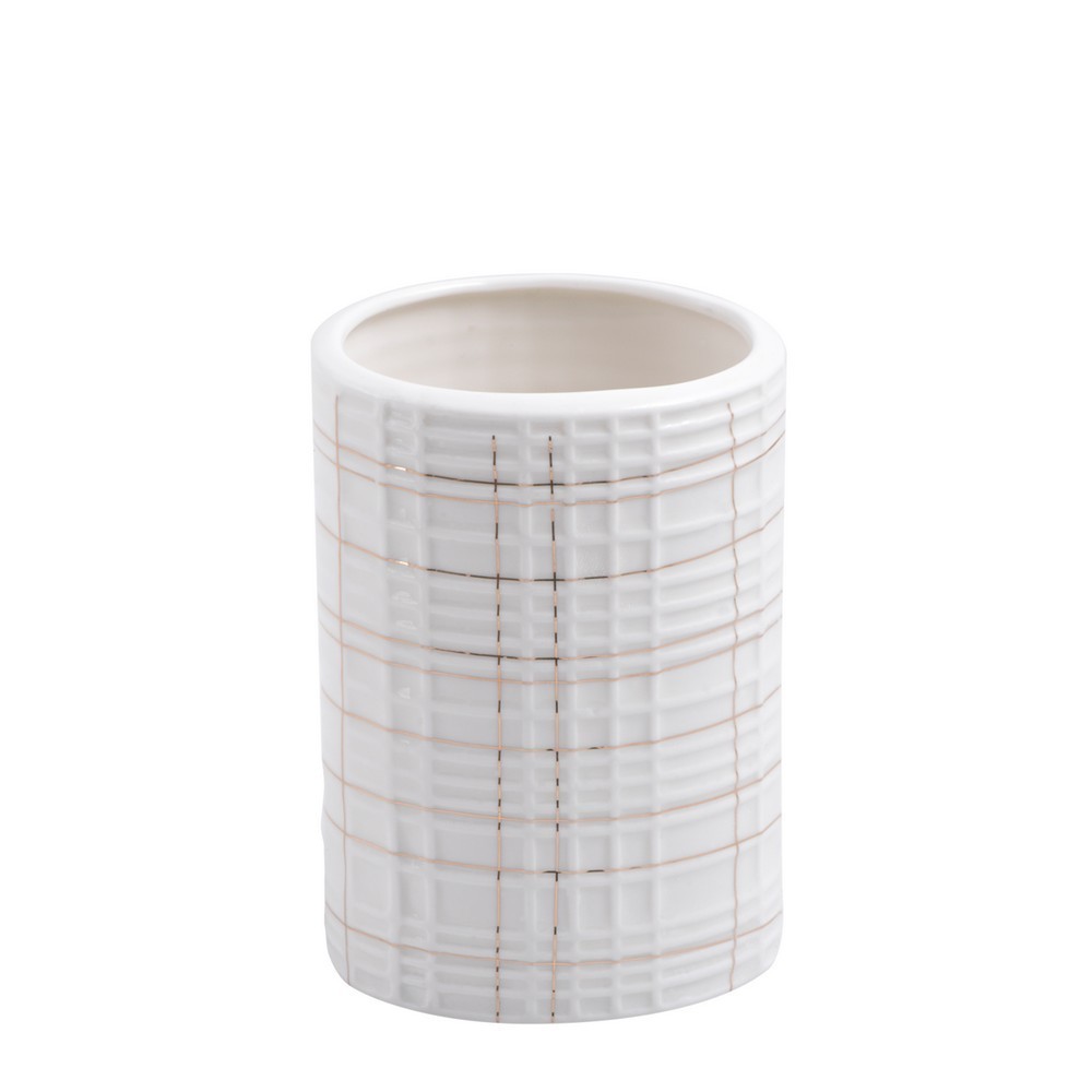 Hrnček zo série ALIZE. Je vyrobená z porcelánu krémovej farby s hnedou mriežkou.