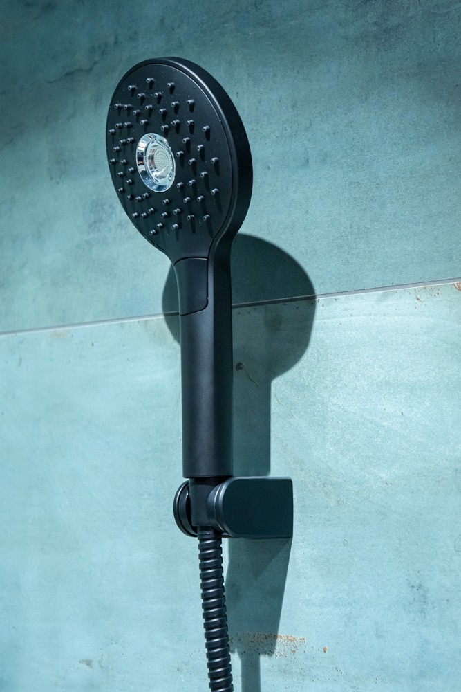 Veľmi užitočný držiak pre sprchové ružice v modernej čiernej farbe môžete doplniť o sprchové batérie, sprchové ružice alebo hadice.