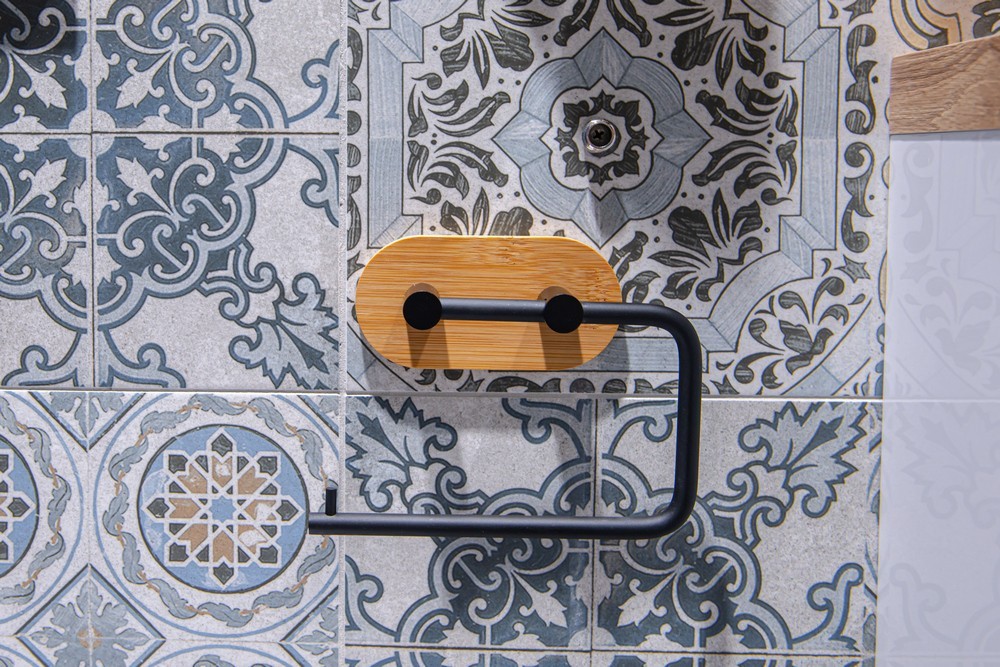 Držiak toaletného papiera z kvalitnej, čierno lakovanej, ocele v kombinácii s populárnym bambusom . Najväčšou výhodou tohto vešiaka je jednoduché lepenie na obklady pomocou veľmi silnej 3M pásky. Samolepiace kúpeľňové doplnky sú ideálnym riešením, pokiaľ nechcete vŕtať do obkladov. Veľmi kvalitná lepiaca páska 3M priľne k rôznym povrchom a umožňuje ľahké odstránenie doplnkov bez zanechania stôp či poškodenia. Jeho maximálna nosnosť je 1 kg.