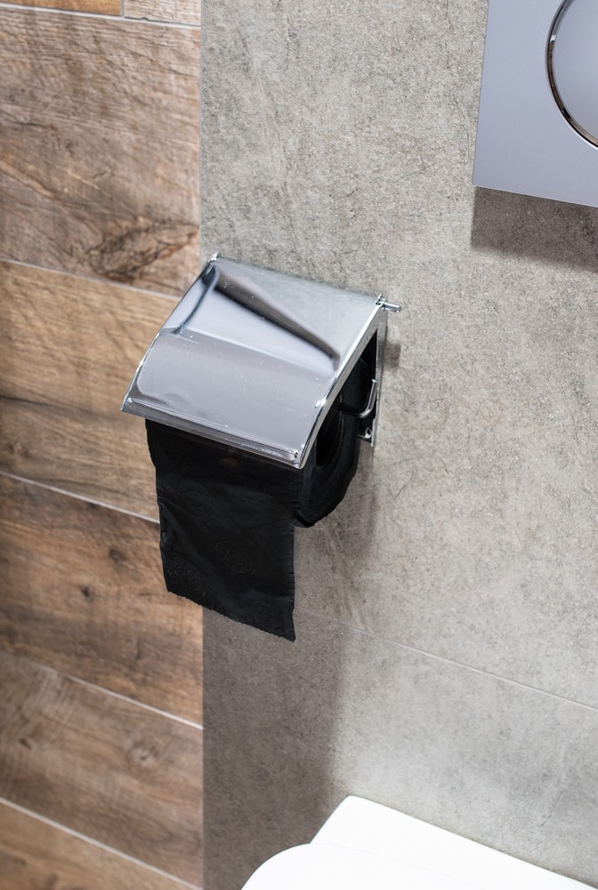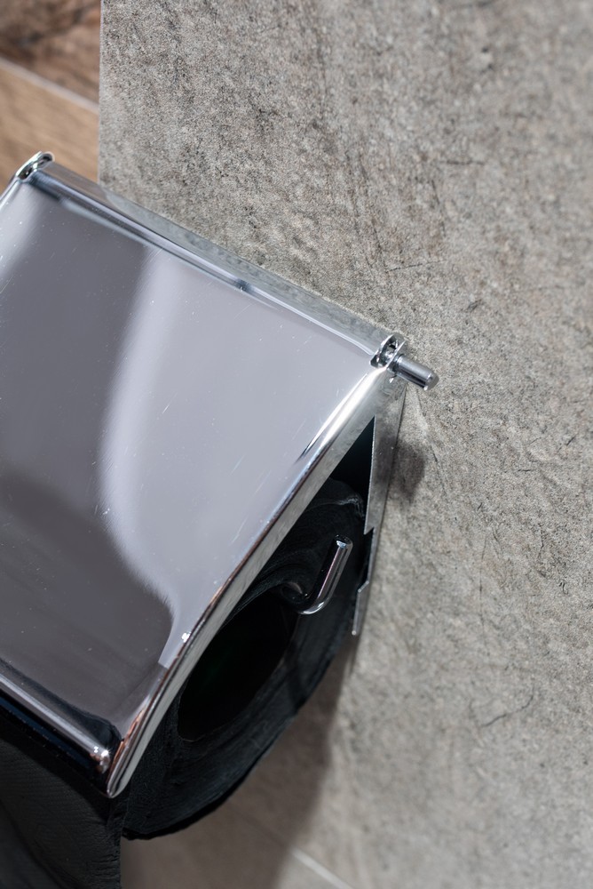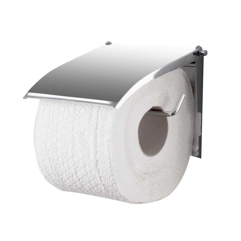 Držiak toaletného papiera s chlopňou z chrómovanej ocele. Sada obsahuje montážne prvky (montáž na stenu pomocou skrutiek a hmoždiniek).