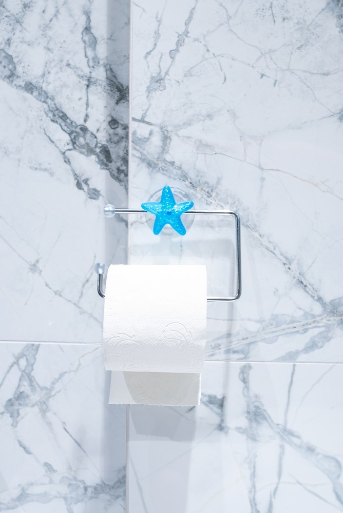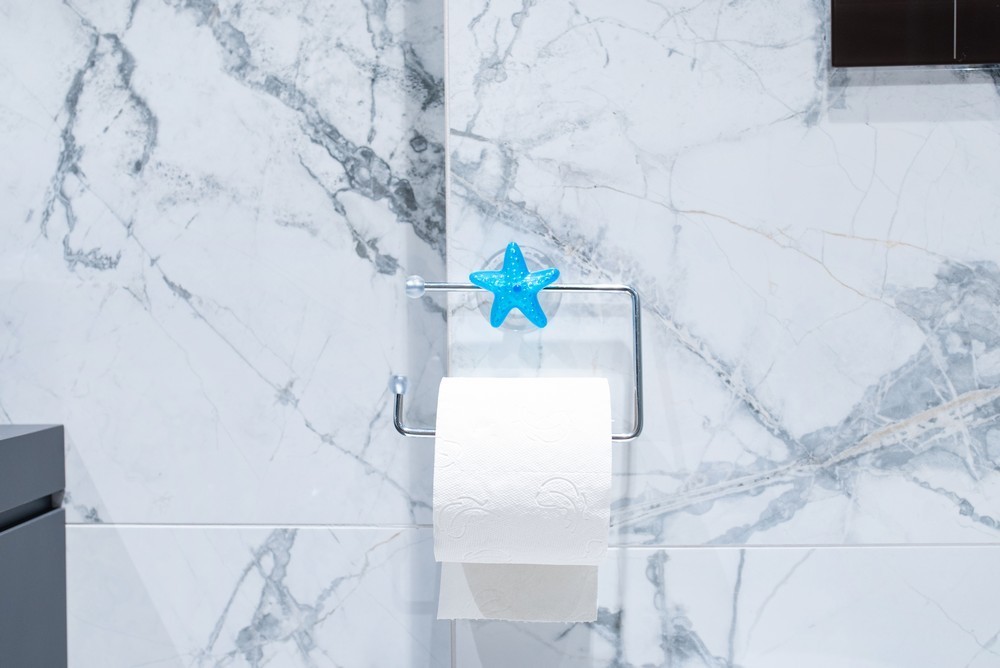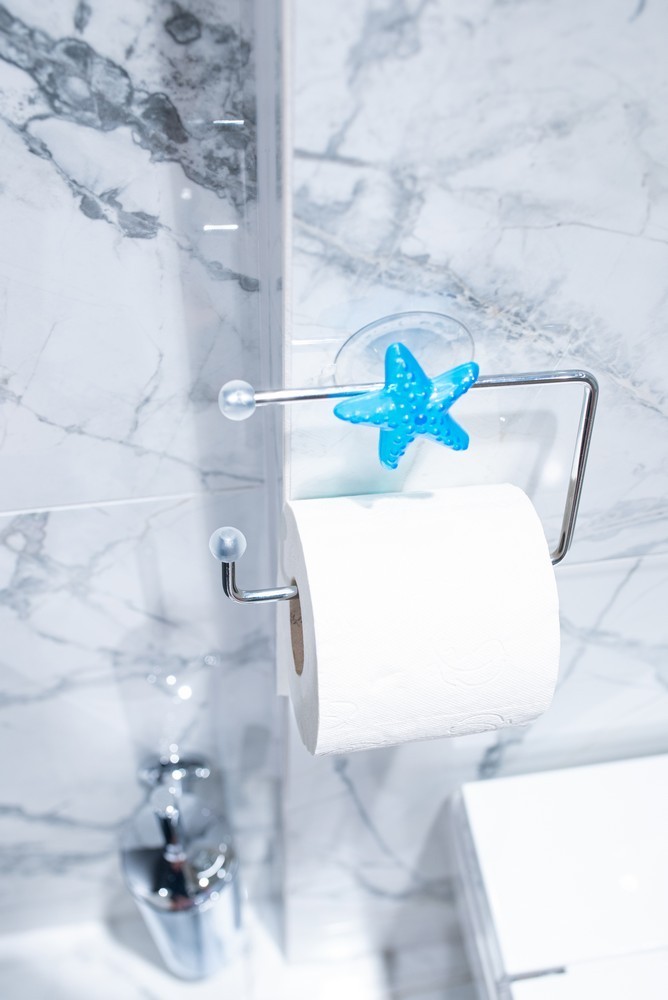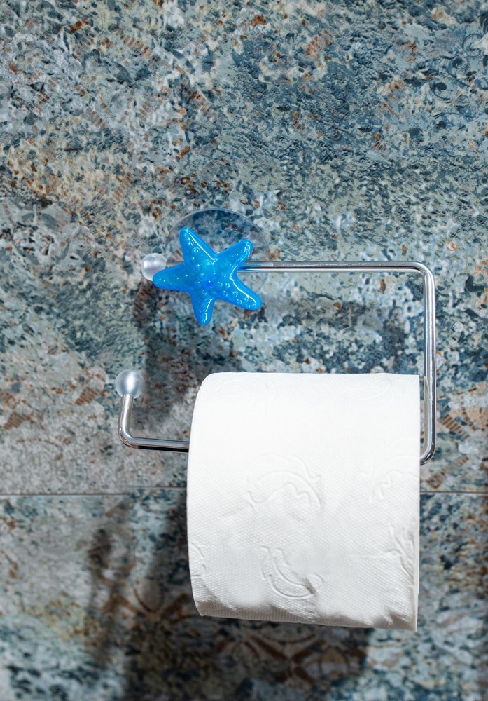 Držiak toaletného papiera sa jednoducho inštaluje pomocou ozdobnej prísavky s modrou hviezdou.