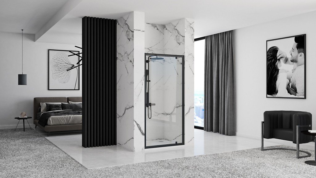Otváracie sprchové dvere Rapid Swing sú veľmi obľúbené u zákazníkov, ktorí majú kúpeľňu ladenú do minimalistického či industriálneho štýlu. Čierne hliníkové profily po obvode ľahko rámujú priehľadné tvrdené sklo, ktoré zachová svetlosť aj tej najmenšej kúpeľne.