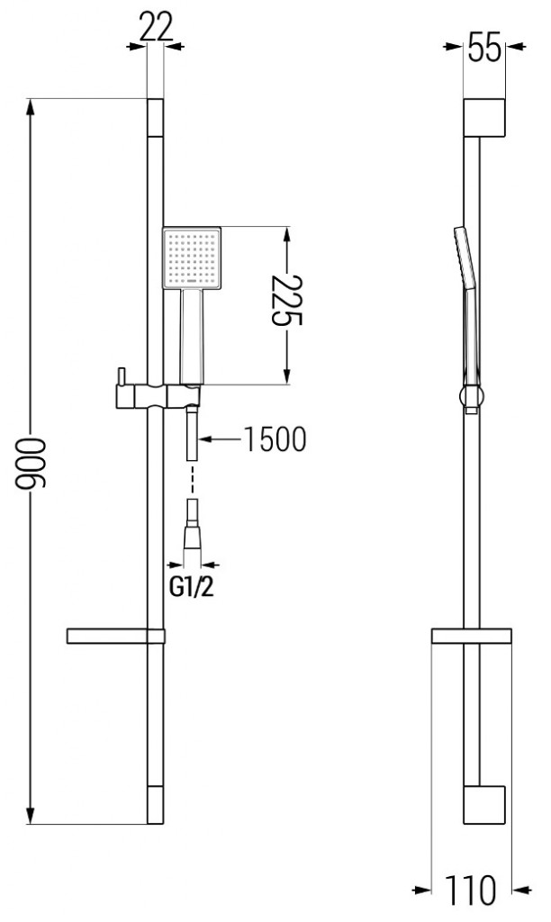 Rozmery držiaka sú: šírka lišty 22 mm, výška 900 mm a hĺbka od steny je 110 mm.
