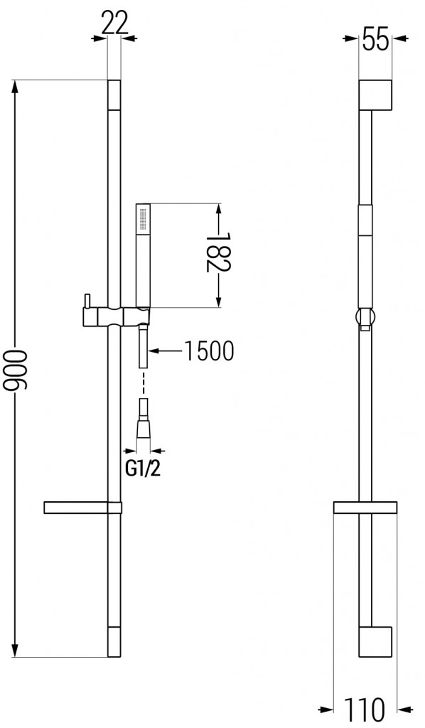 Rozmery držiaka sú: šírka lišty 22 mm, výška 900 mm a hĺbka od steny je 110 mm.