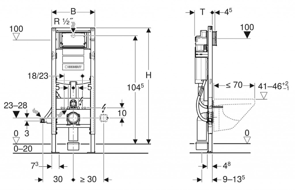 - Vybavený rúrkovou chráničkou pre prívodné potrubie na pripojenie sprchovacích WC Geberit AquaClean