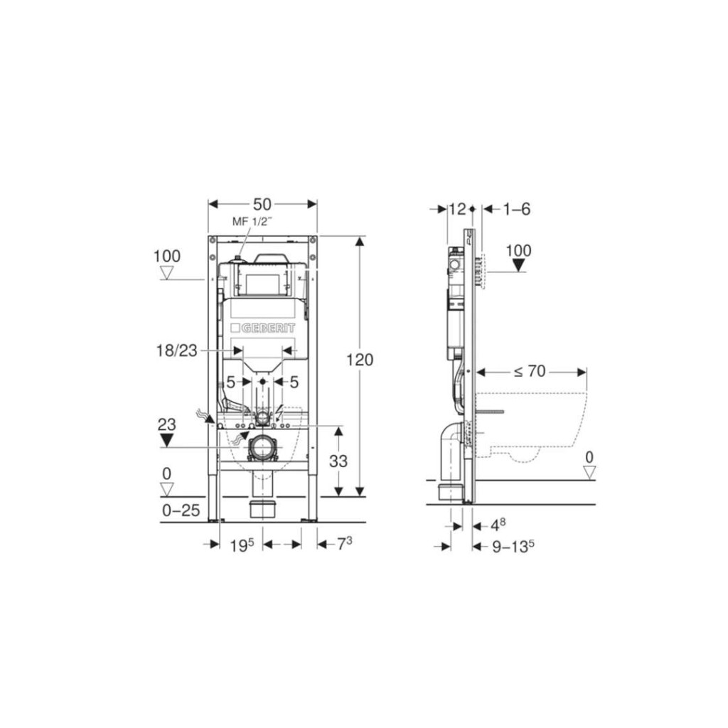 Montážny prvok Geberit Duofix pre závesné WC, 120 cm, so splachovacou nádržkou pod omietku Sigma 12 cm, s hygienickým preplachom HS50 - 1 prívod vody