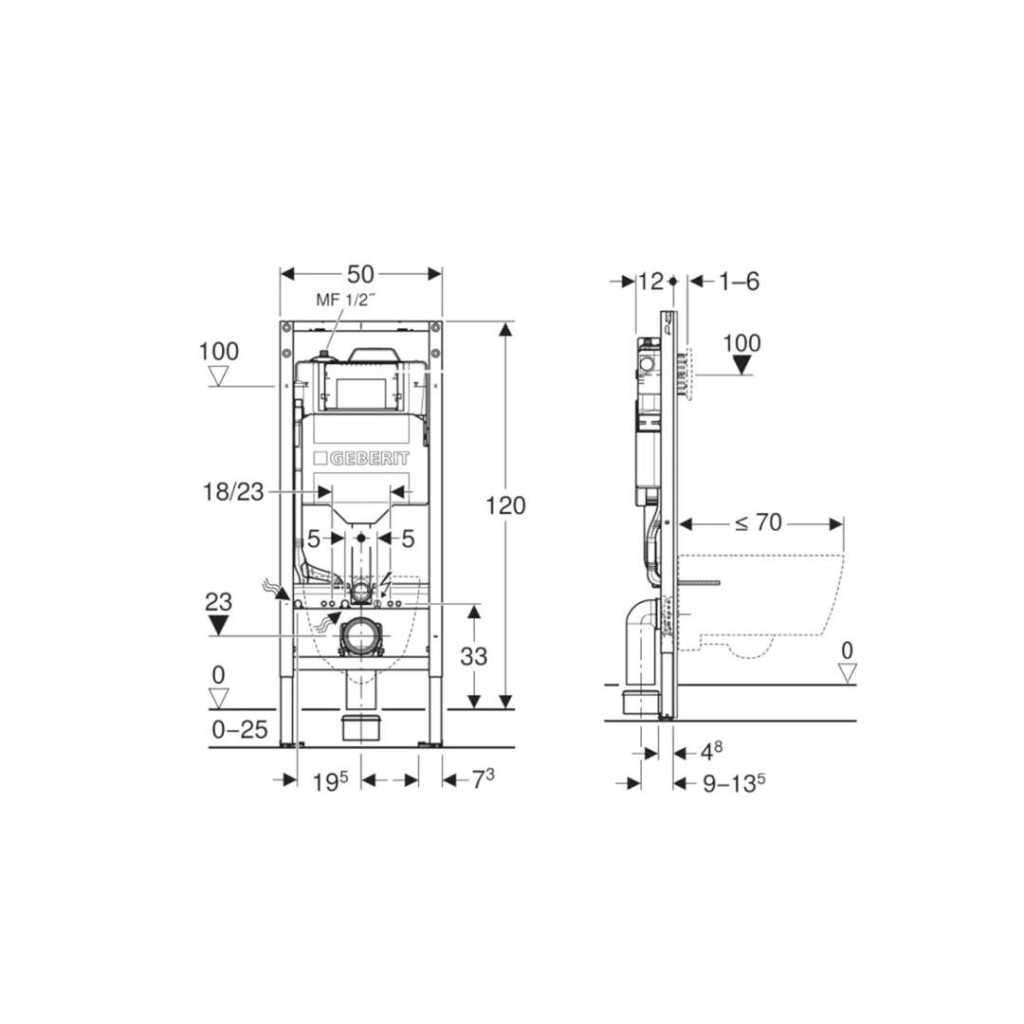 - Rám pre závesné WC s pripojovacími rozmermi podľa EN 33 a vyložením až 70 cm