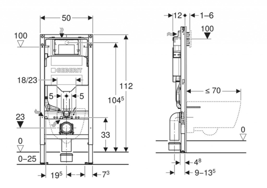 - Rám pre závesné WC s pripojovacími rozmermi podľa EN 33 a vyložením až 70 cm