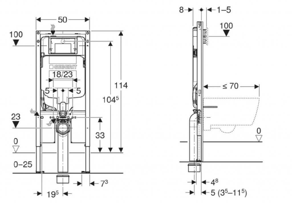 - Rám pre závesné WC s pripojovacími rozmermi podľa EN 33 a vyložením až 70 cm