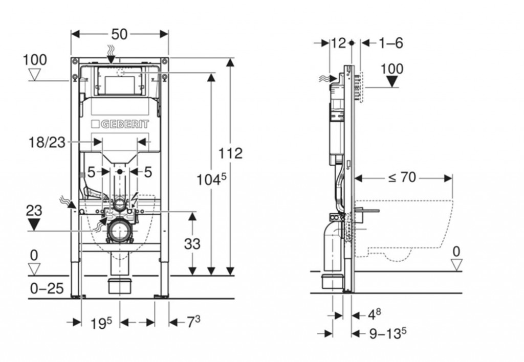 - Rám pre závesné WC s pripojovacími rozmermi podľa EN 33 a vyložením až 70 cm