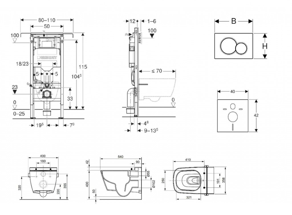 - Rám pre závesné WC s pripojovacími rozmermi podľa EN 33 a vyložením až 70 cm