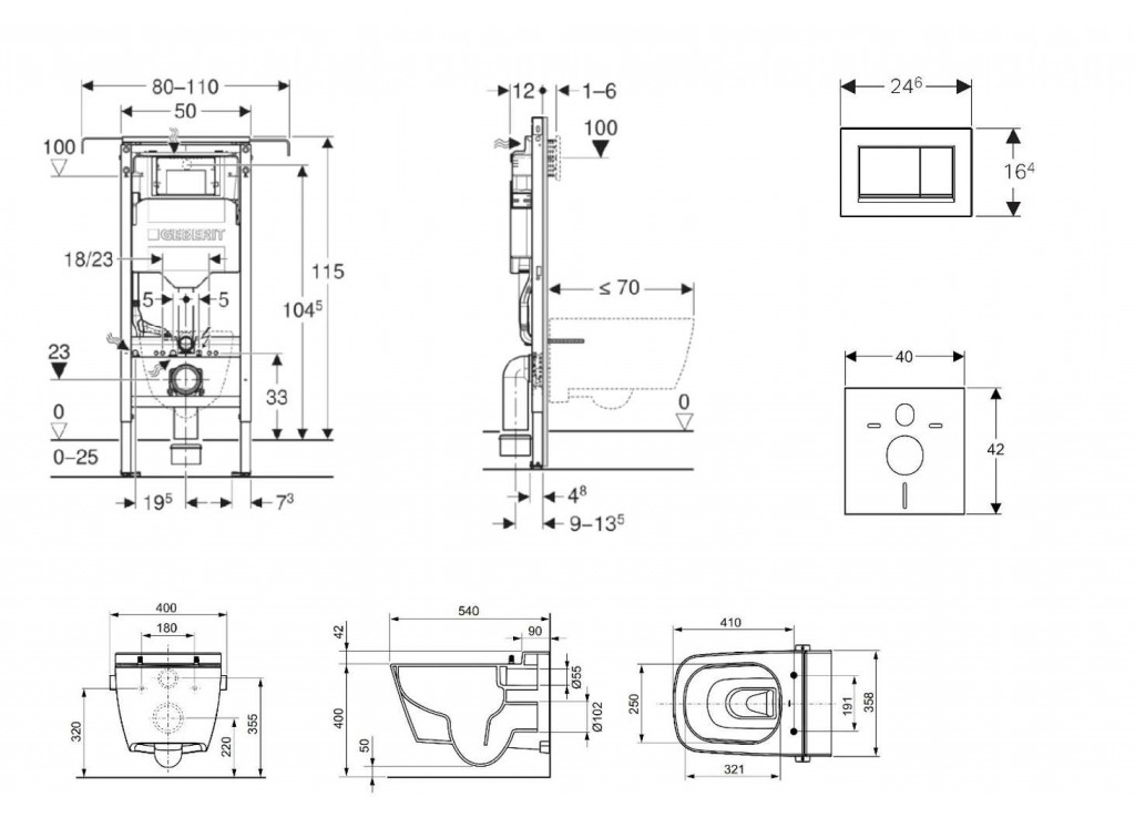 - Rám pre závesné WC s pripojovacími rozmermi podľa EN 33 a vyložením až 70 cm