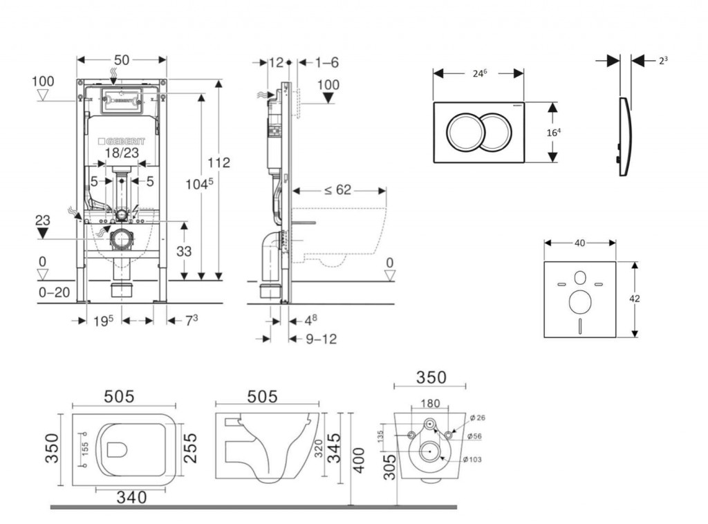 - rám pre nástenné WC s pripojovacími rozmermi podľa EN 33 a presahom do 62 cm