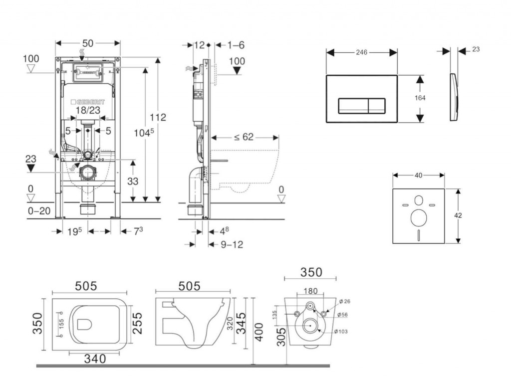 - rám pre nástenné WC s pripojovacími rozmermi podľa EN 33 a presahom do 62 cm