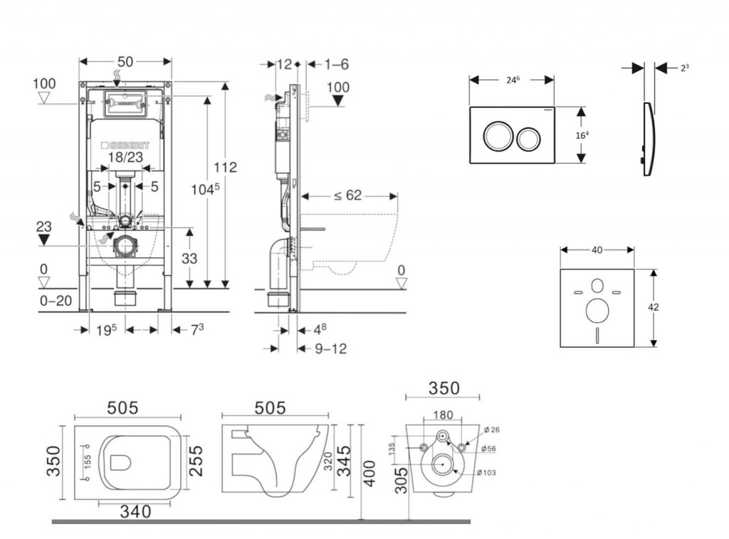 - rám pre nástenné WC s pripojovacími rozmermi podľa EN 33 a presahom do 62 cm