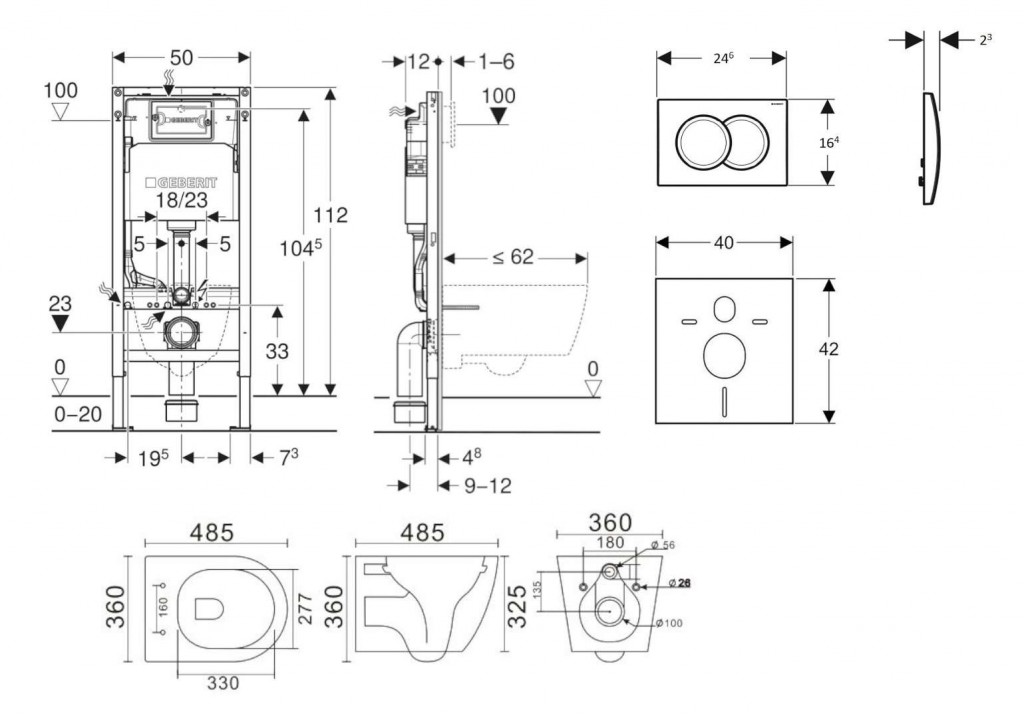 - rám pre nástenné WC s pripojovacími rozmermi podľa EN 33 a presahom do 62 cm