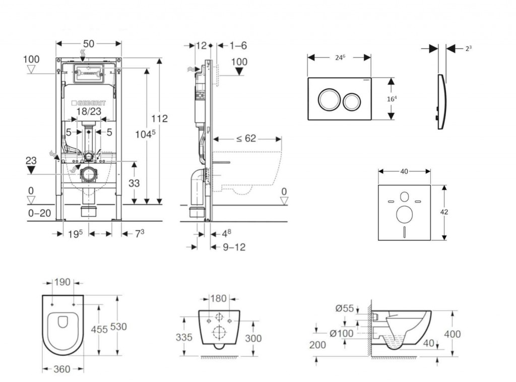 - rám pre nástenné WC s pripojovacími rozmermi podľa EN 33 a presahom do 62 cm