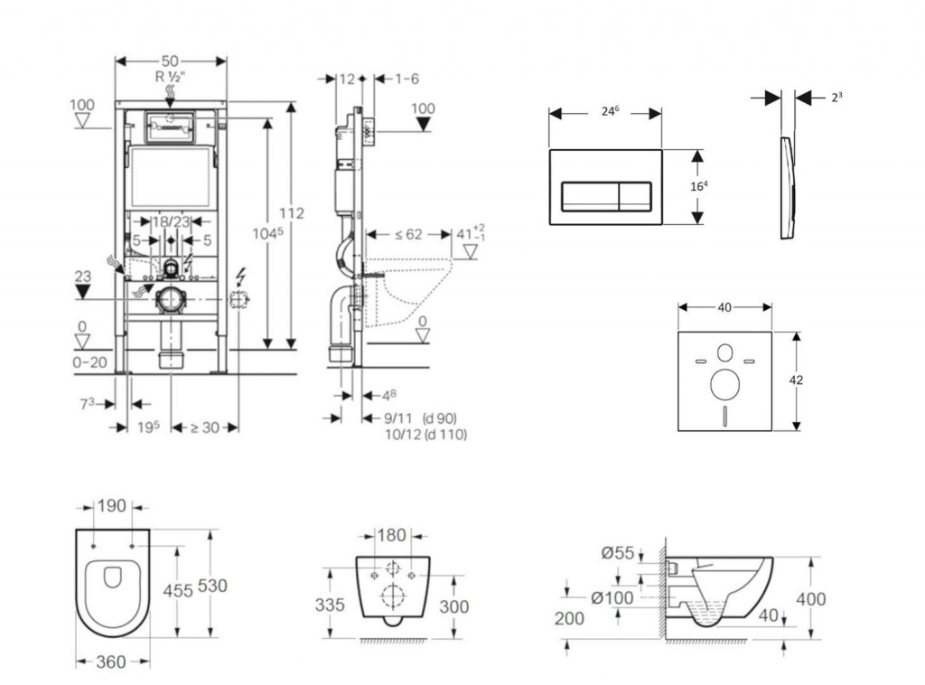 - pre montáž závesného WC so vzdialenosťou upevnenia 18 cm alebo 23 cm