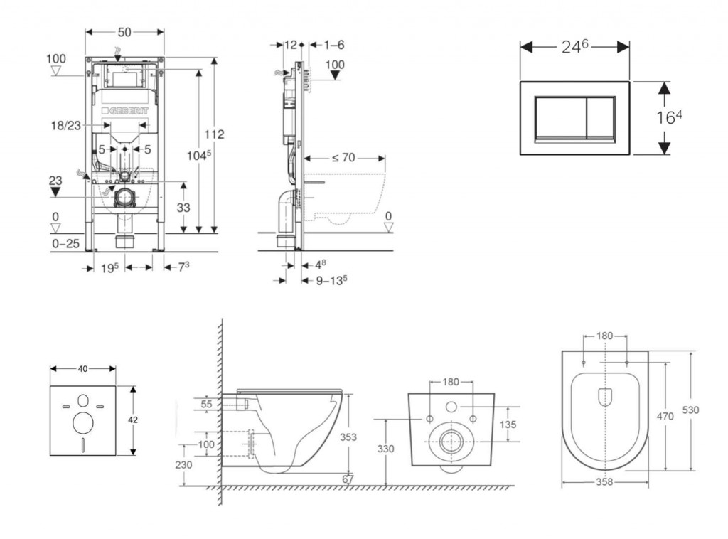 - pre závesné WC s pripojovacími rozmermi podľa EN 33 a presahom do 70 cm