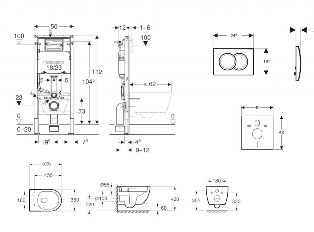 - rám pre nástenné WC s pripojovacími rozmermi podľa EN 33 a presahom do 62 cm