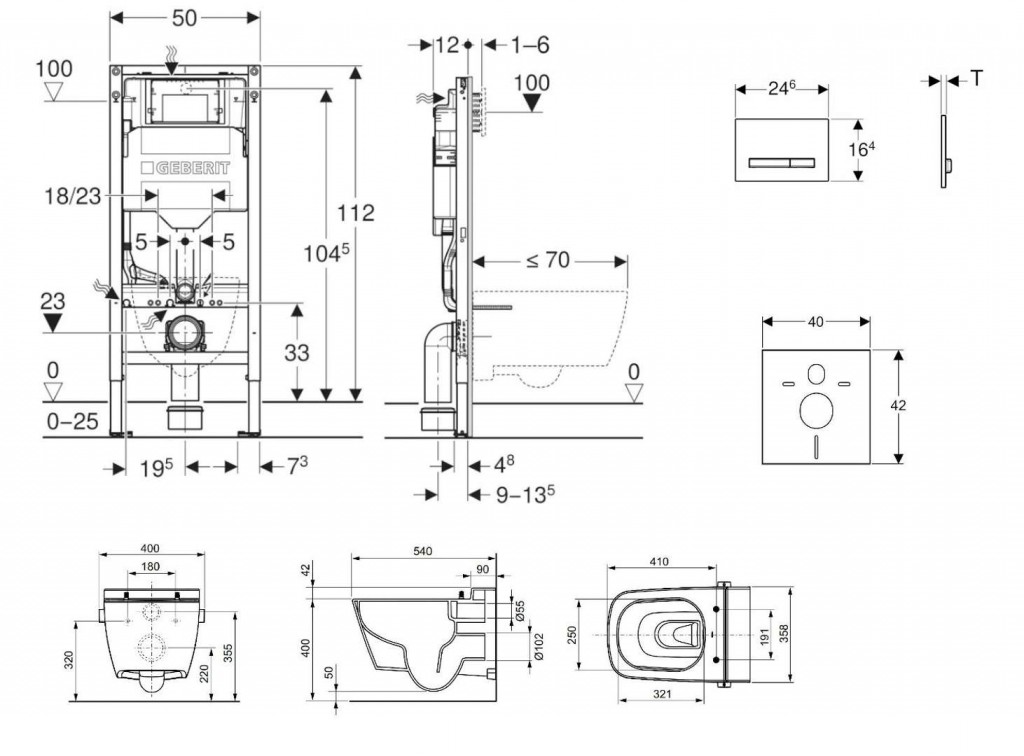 - pre závesné WC s pripojovacími rozmermi podľa EN 33 a presahom do 70 cm