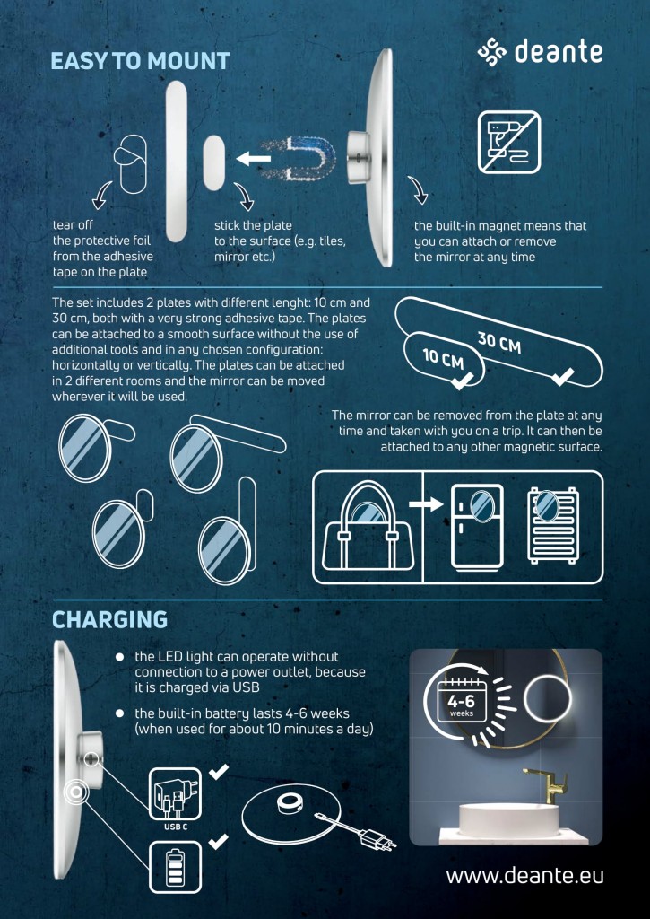 V každej kúpeľni by nemalo chýbať kozmetické zrkadlo . Používa sa nielen na make-up alebo holenie. Dokáže opticky zväčšiť malý priestor a dodať interiéru charakter. Vďaka tradičnej povrchovej úprave sa skvele hodí k dreveným, kamenným alebo kovovým prvkom. Predovšetkým zabraňujú vniknutiu vody medzerou medzi sklom a pevnou stenou. Zrkadlo navyše 3x zväčšuje , čo je neoceniteľné pre presné kozmetické procedúry. L zo ho pripevniť na akýkoľvek iný povrch, ktorý priťahuje magnet.