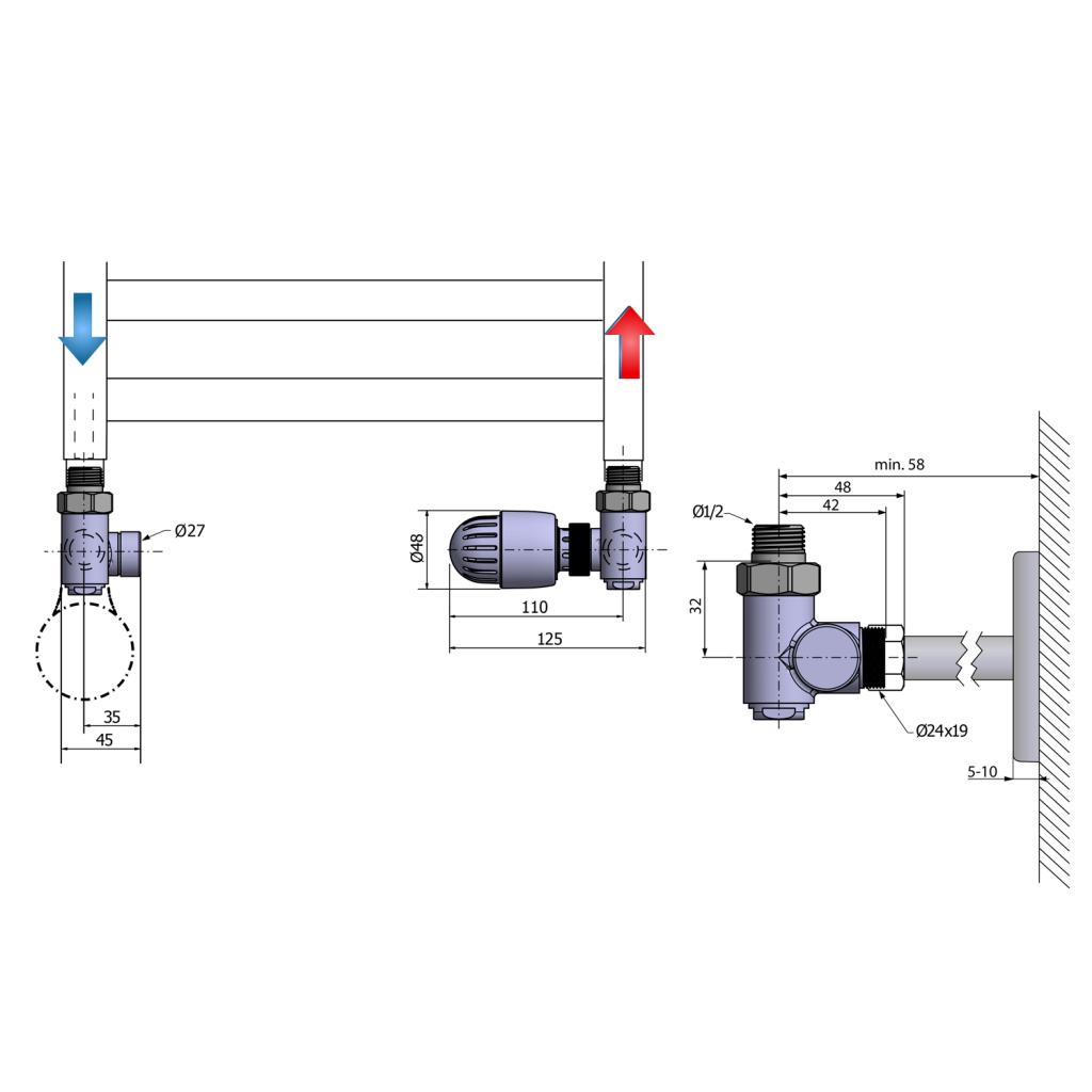 Pokiaľ sa jedná o teleso so stredovým pripojením, záleží na tom, či možno tyč prepojiť cez ventil (v tomto prípade sa použije kombinovaný ventil) alebo sa tyč pripája samostatne do stojky telesa (v tomto prípade sa použije klasický ventil). V prípade bočného pripojenia sa vždy použije kombinovaný ventil. Na výber je použitie ručného ventilu alebo ventilu s termostatickou hlavicou.