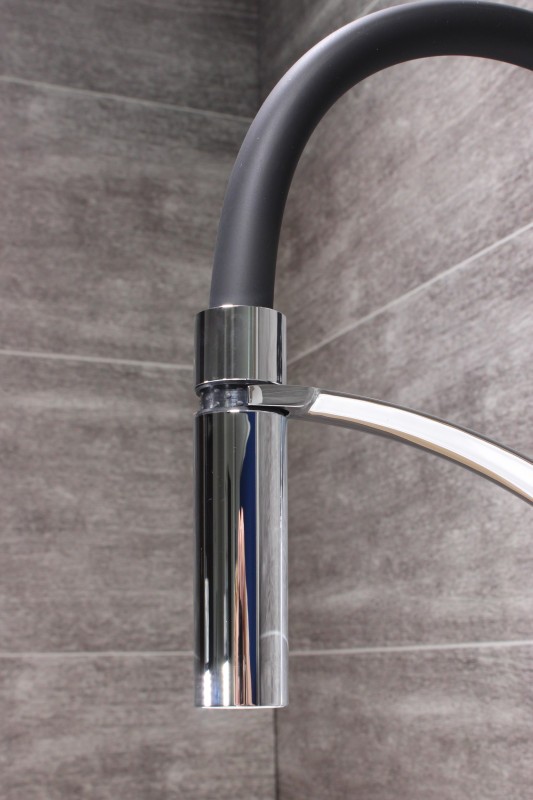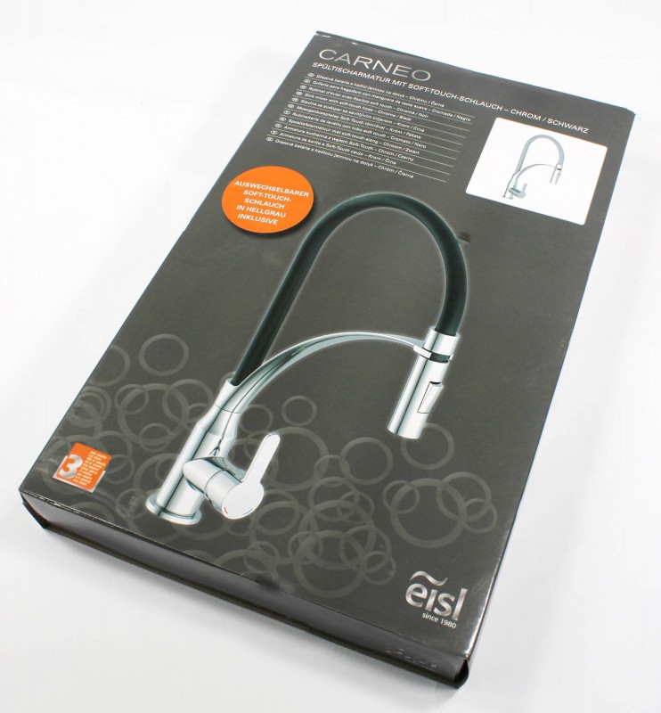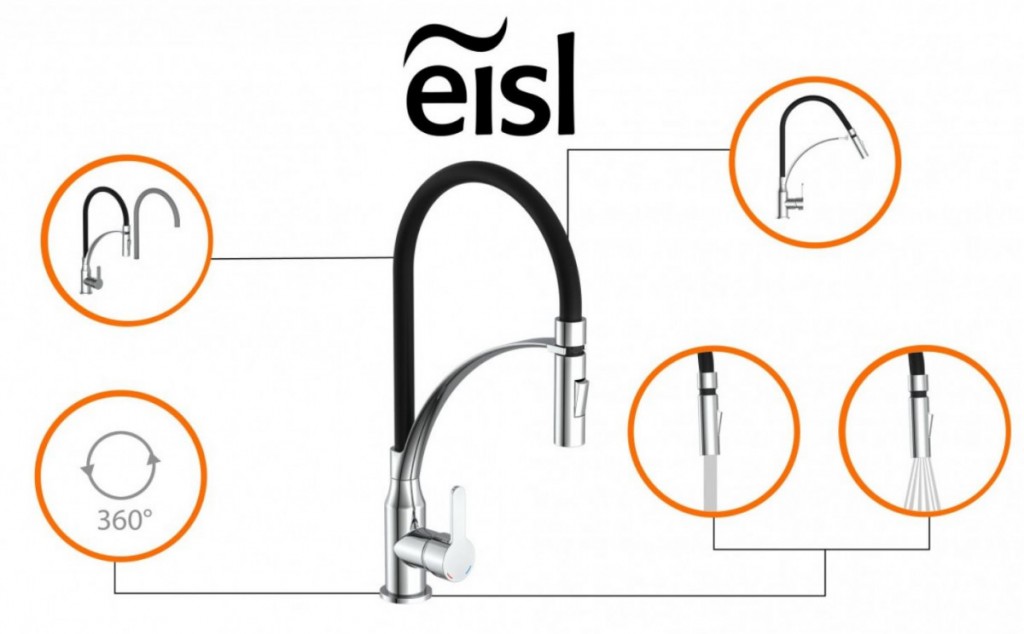 Vysoká drezová batéria Eisl Carneo sa bude skvele vynímať aj ako ostrovčeková batéria. Batéria disponuje pružnou hlavicou pre jednoduchšiu manipuláciu v kuchyni. Zároveň na konci hlavice nájdete prepínač trysky alebo sprchy.