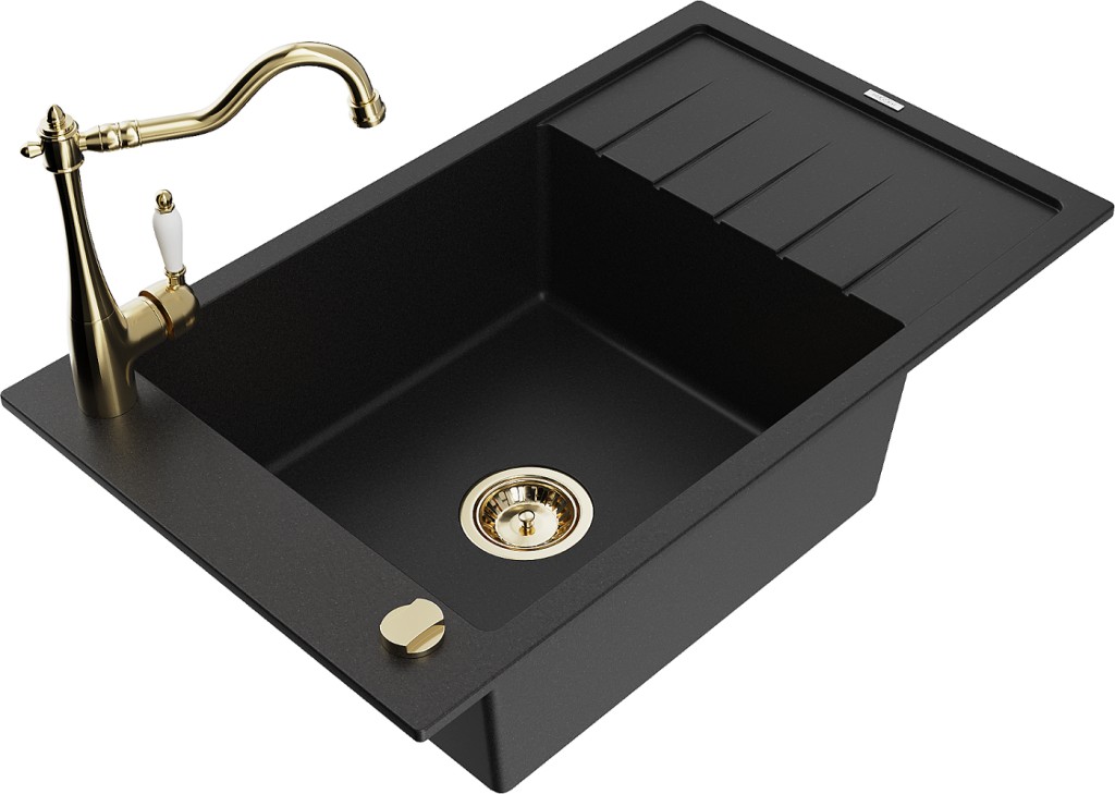 Technické dáta: drez: Rozmer: 795 x 480 x 200 mm Hĺbka komory: 190 mm Rozmery komory: 465x420 mm Priemer odtoku: ø90 mm Typ: 1-miska s krátkym odkvapkávačom Typ: Zapustené do pracovnej dosky Čierna farba Povrchová úprava sifónu: zlatá Materiál: žula… (celý popis)