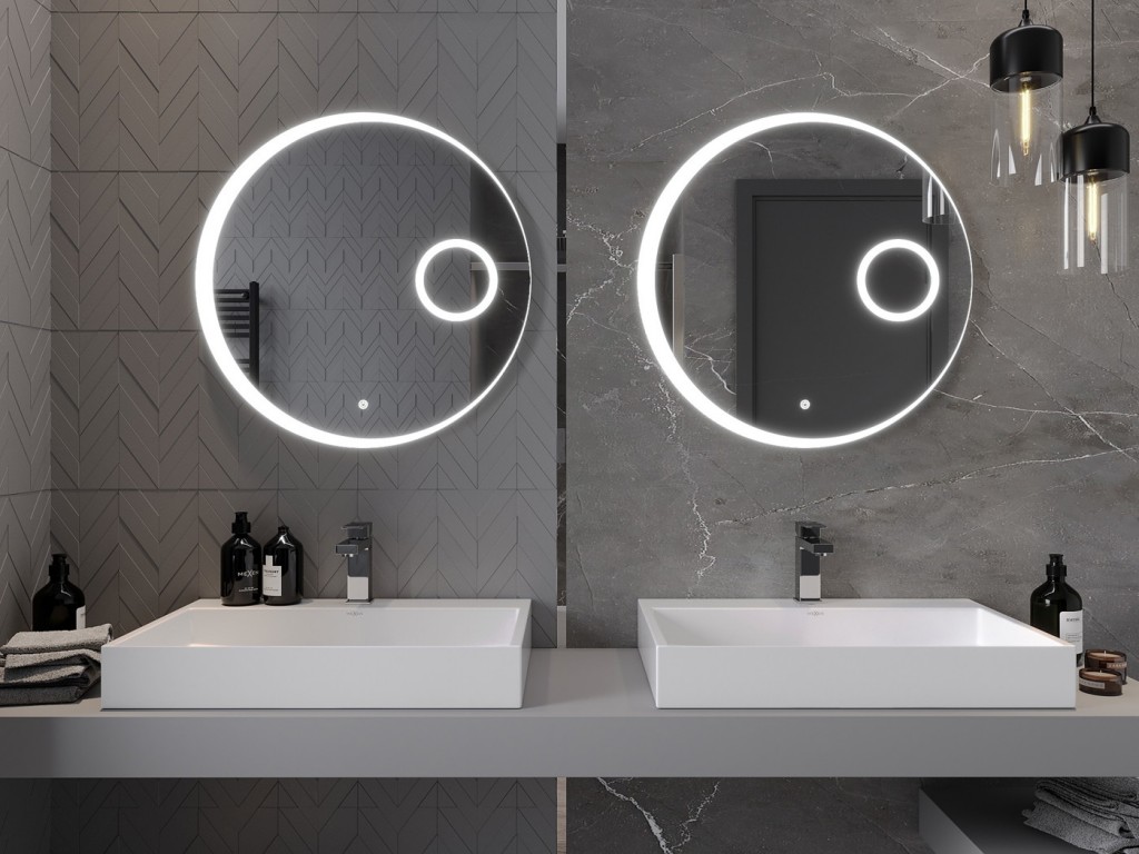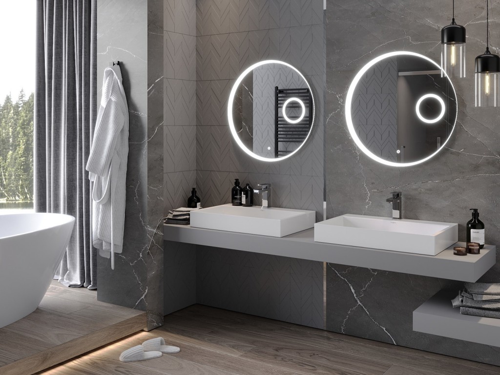 Moderné okrúhle zrkadlo kolekcie ELLA je vybavené LED podsvietením, ktoré sa ľahko ovláda pomocou dotykového tlačidla priamo na ploche zrkadla . Zrkadlo je vybavené vyhrievacou podložkou ANTI-CAR , ktorá eliminuje zahmlenie skla.