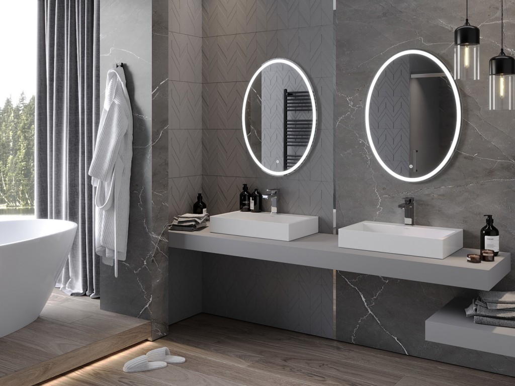 Moderné a jednoduché oválne zrkadlo kolekcie ELZ je vybavené LED podsvietením, ktoré sa ľahko ovláda pomocou dotykového tlačidla priamo na ploche zrkadla . Zrkadlo je vybavené vyhrievacou podložkou ANTI-CAR , ktorá eliminuje zahmlenie skla.