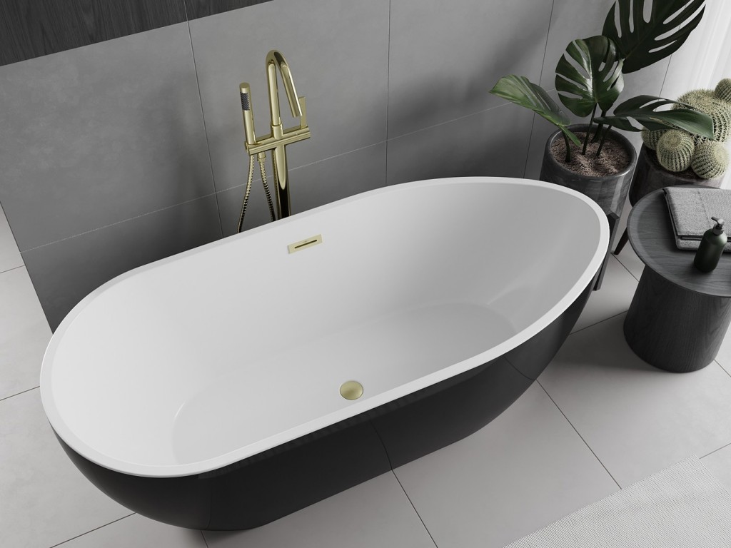 Mexen Eos je elegantná voľne stojaca vaňa s rozmermi 150 x 75 cm, vyrobená zo sanitárneho akrylátu, ktorý zaisťuje životnosť a odolnosť proti UV žiareniu. Jeho štýlová čiernobiela farba a zlatý kartáčovaný povrch mu dodávajú jedinečný charakter. Vaňa sa ľahko inštaluje a má uprostred funkciu prepadu a odtoku, čo zvyšuje komfort používania. Súprava obsahuje sifón a zástrčku click-clack, ktorá uľahčuje inštaláciu a každodenné používanie.