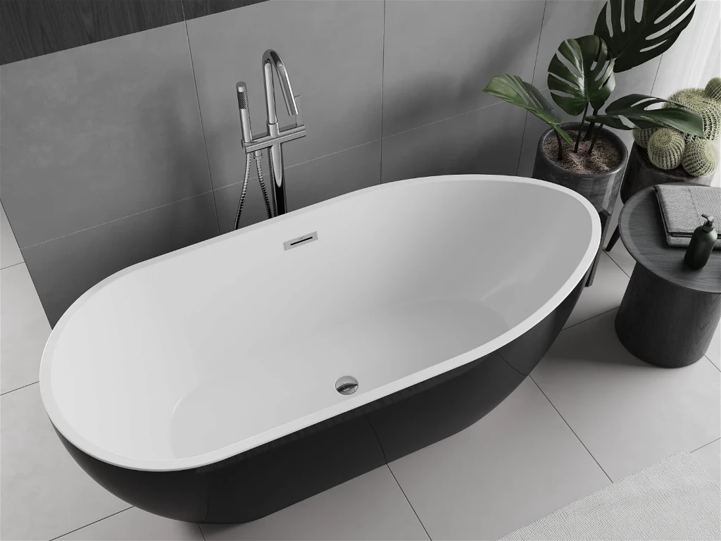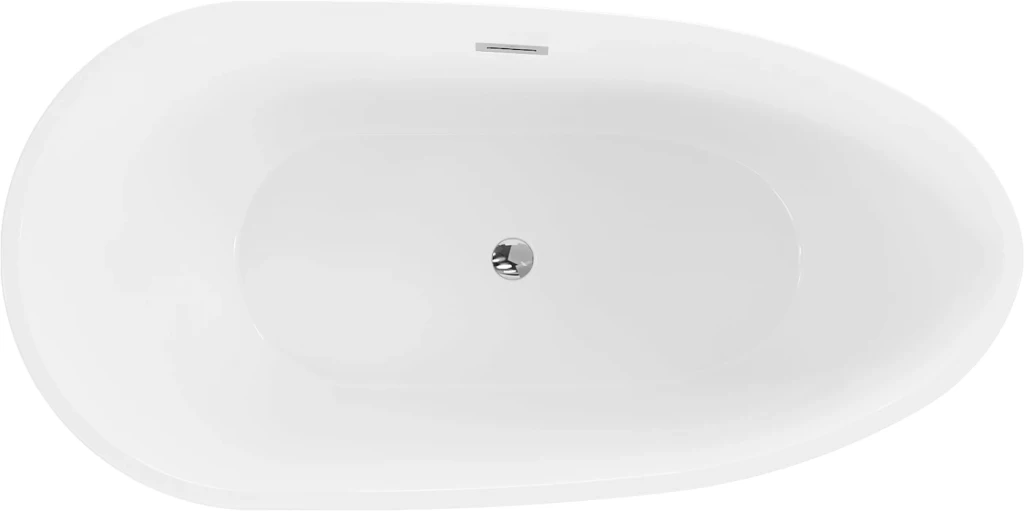 Voľne stojaca oválna akrylátová vaňa série EOS od výrobcu MEXEN s prepadom a umiestnenom odpade na strede vane.