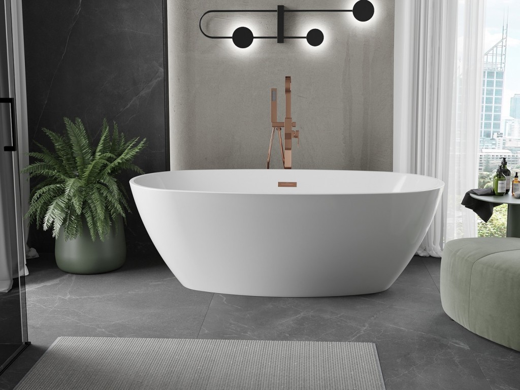 Voľne stojaca vaňa s rozmermi 180 x 95 cm je ideálnym riešením pre ľudí, ktorí si cenia eleganciu a pohodlie. Vyrobené zo sanitárneho akrylátu, je odolné voči zašívaniu a UV žiareniu, čo zaisťuje trvanlivosť a jednoduchú údržbu. Jeho oválny tvar a biela farba doplnená o detaily z ružového zlata dodávajú interiéru luxusný charakter. Vaňa je navyše vybavená prepadovým otvorom a sada obsahuje praktický sifón a zaklapávacou zátkou.