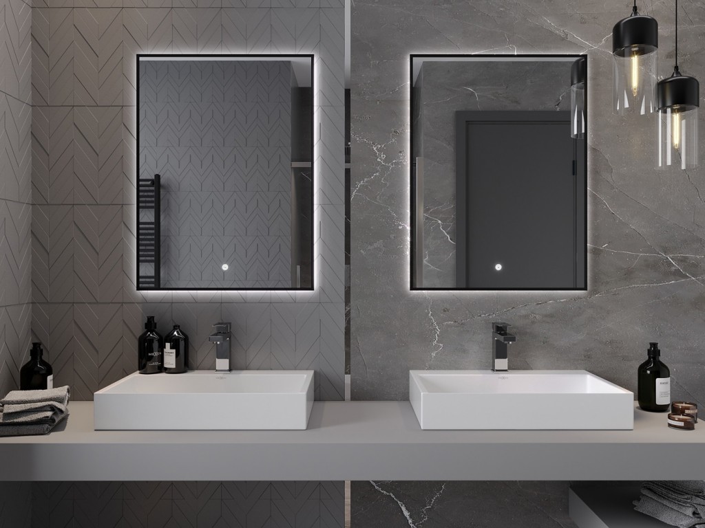 Moderné a jednoduché obdĺžnikové zrkadlo kolekcie ERMA s čiernym rámom je vybavené LED podsvietením, ktoré sa ľahko ovláda pomocou dotykového tlačidla priamo na ploche zrkadla . Zrkadlo je vybavené vyhrievacou podložkou ANTI-CAR , ktorá eliminuje zahmlenie skla.