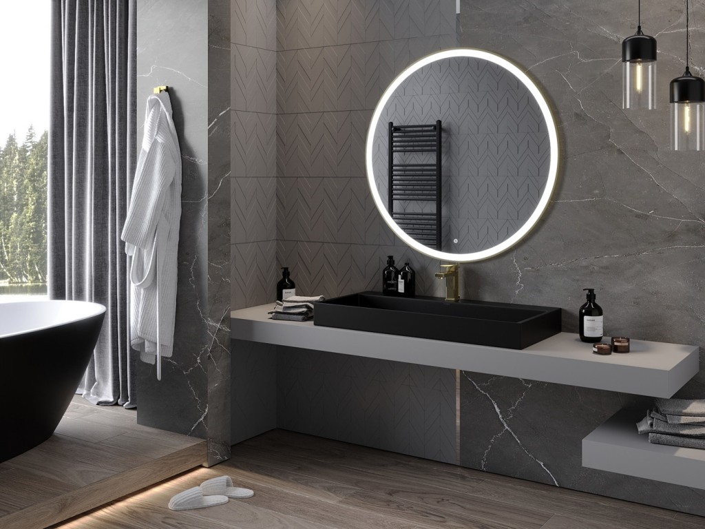 Moderné a jednoduché okrúhle zrkadlo kolekcie ESSO je vybavené LED podsvietením, ktoré sa ľahko ovláda pomocou dotykového tlačidla priamo na ploche zrkadla . Zrkadlo je vybavené vyhrievacou podložkou ANTI-CAR , ktorá eliminuje zahmlenie skla.
