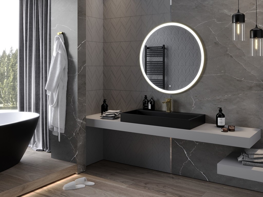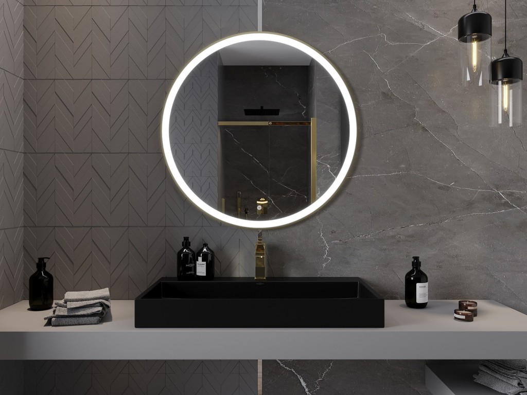 Moderné a jednoduché okrúhle zrkadlo kolekcie ESSO je vybavené LED podsvietením, ktoré sa ľahko ovláda pomocou dotykového tlačidla priamo na ploche zrkadla . Zrkadlo je vybavené vyhrievacou podložkou ANTI-CAR , ktorá eliminuje zahmlenie skla.