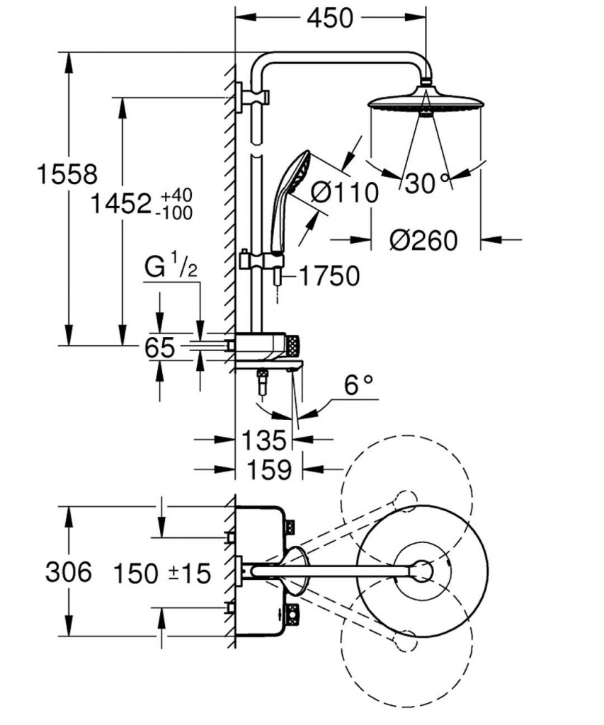 - hlavovú sprchu Euphoria 260 (26455), tri druhy prúdu: Rain, SmartRain, Jet, s guľovým kĺbom a uhlom otáčania ± 15 °