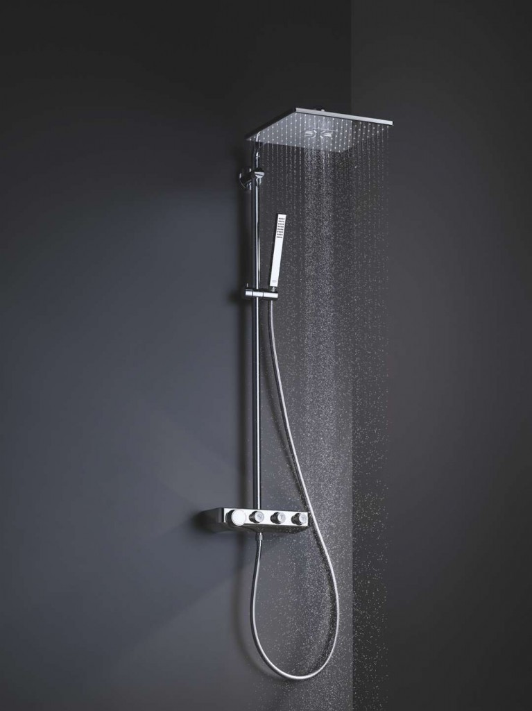 - hlavovú sprchu Rainshower 310 SmartActive Cube s chrómovým sprchovým diskom, s režimom prúdu GROHE PureRain kombinovaným s výkonnou stredovou tryskou - systém DUO