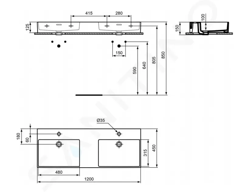 Obdĺžnikové dvojumývadlo na dosku / skrinku