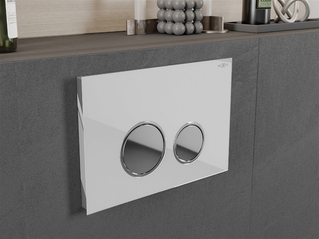 Ovládacie dvojčinné sklenené tlačidlo je určené na podomietkové splachovacie nádrže FENIX SLIM - 60100, FENIX AIR - 60500 od výrobcu MEXEN a je kompatibilný s Geberit Sigma UP300 a UP320 .
