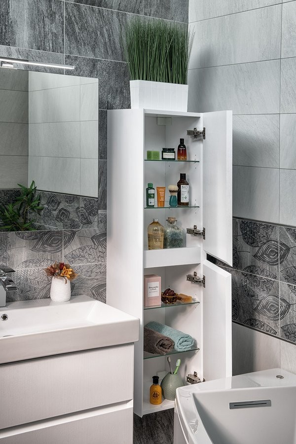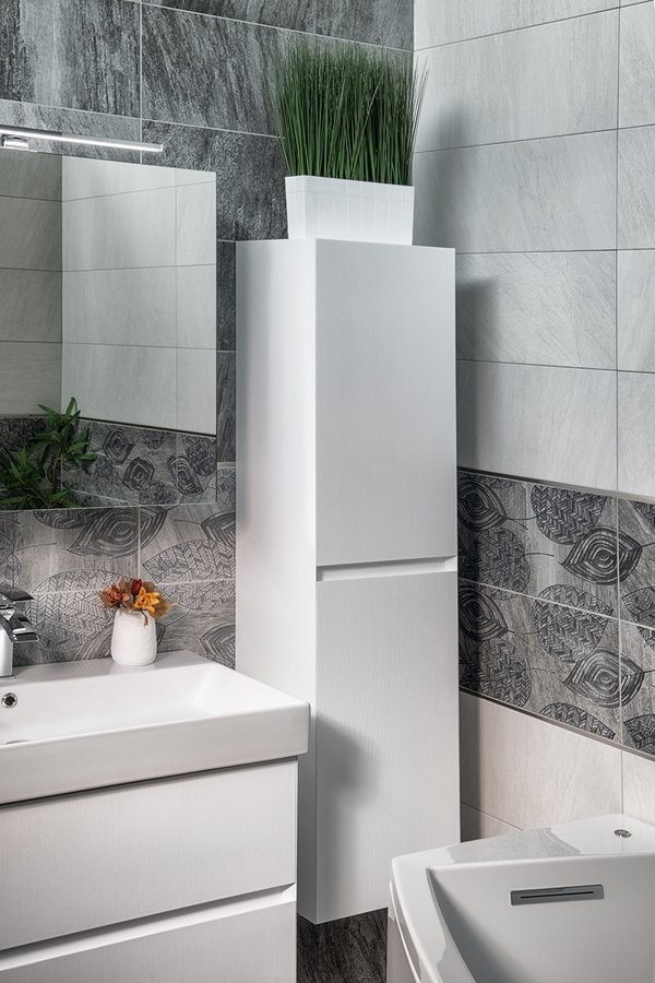 Dokonale decentná séria kúpeľňového nábytku FILENA ponúka skrinky z dubovej dyhy v prírodnom prevedení dekoru dreva ošetrenom transparentným lakom av bielom matnom lakovaní.