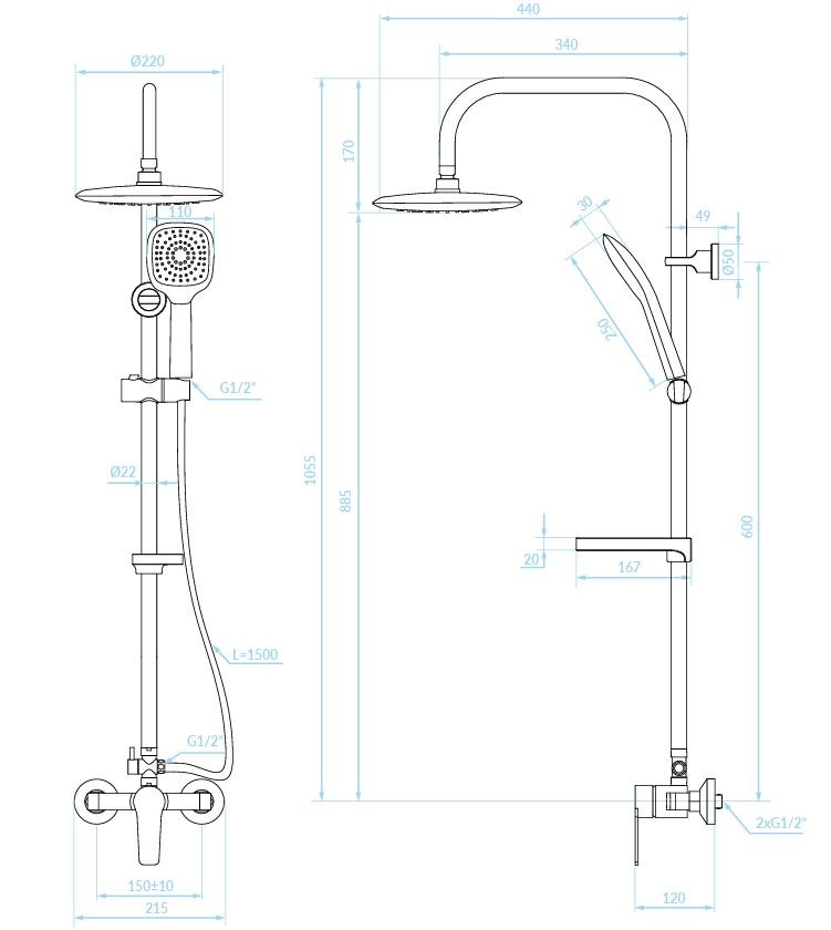Výška stĺpu je 1055 mm , s celkovou šírkou 220 mm a hĺbkou 440 mm, čo zaisťuje pohodlné používanie aj v menších priestoroch. Sprchová hadica je dlhá 1500 mm a vďaka oceľovému opleteniu s gumovým jadrom je zároveň odolná aj flexibilná.