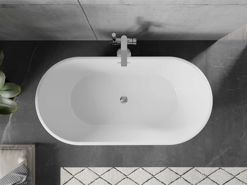 Voľne stojaca oválna akrylátová vaňa série FLAVIA od výrobcu MEXEN s prepadom a umiestnenom odpade na stred vane.