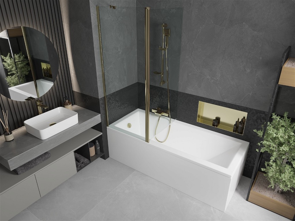 Áno, vaňovú zástenu FLIP od MEXEN s univerzálnou montážou je možné vybrať nielen z farebných variantov profilov: čierna mat, zlato a chróm, ale aj druhu skla, ako je transparentné alebo dekorované.