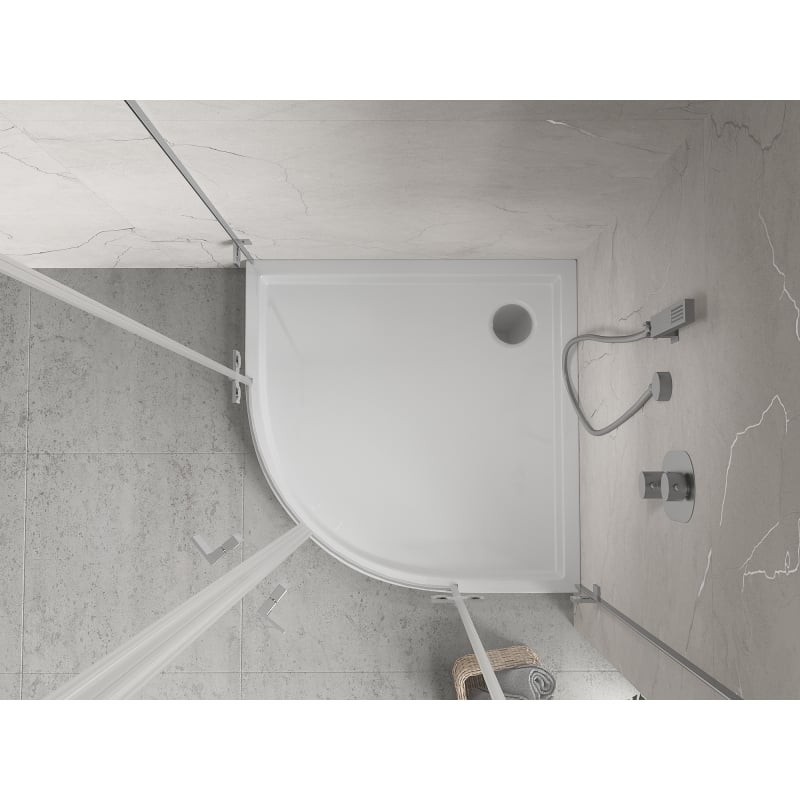 Špecifikácia produktu: Rozmer: 80x80x12 cm Polomer zaoblenia R55 Farba: Lesklá biela Typ: Polkruhový Materiál: Sanitárny akrylát Zosilnené dno Priemer odtoku: 90 mm Sprchová vanička neobsahuje sifón