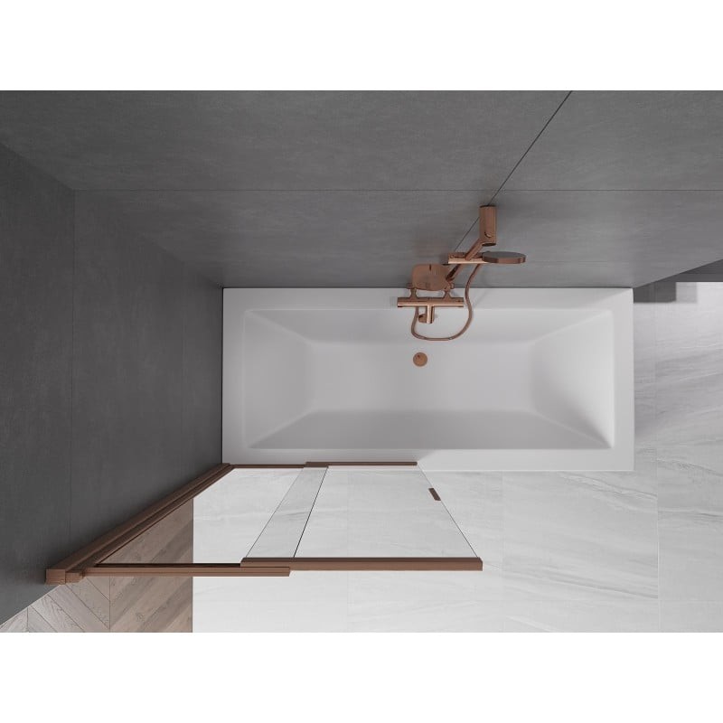 Technické údaje: Šírka: 85 cm Výška: 150 cm Typ: Dvojkrídlové Montáž: Univerzálny Typ: Posuvné/Posuvné Typ skla: Tvrdené Farba skla: Priehľadné Hrúbka skla: 5 mm Povrchová úprava: Kartáčovaná meď Povlak pre ľahké čistenie Vyrovnanie nerovností stien