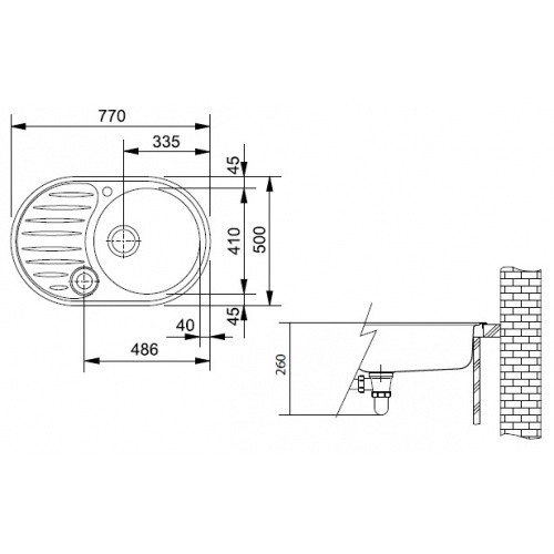 Povrch NEREZ. Spodná skrinka od 450mm (alebo spodnej rohová skrinka od 900x900mm); rozmery 770x500mm; výrez podľa šablóny; drez pr. 410x155mm.